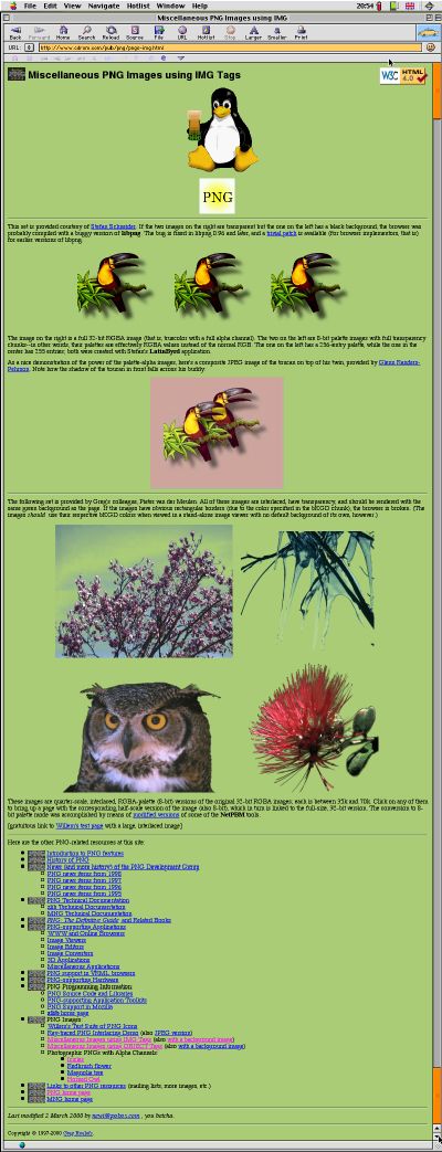 As far as Greg can tell, iCab's rendering of PNG transparency is perfect. However, the browser does not currently do gamma correction (as evidenced by the particularly dark toucans).
