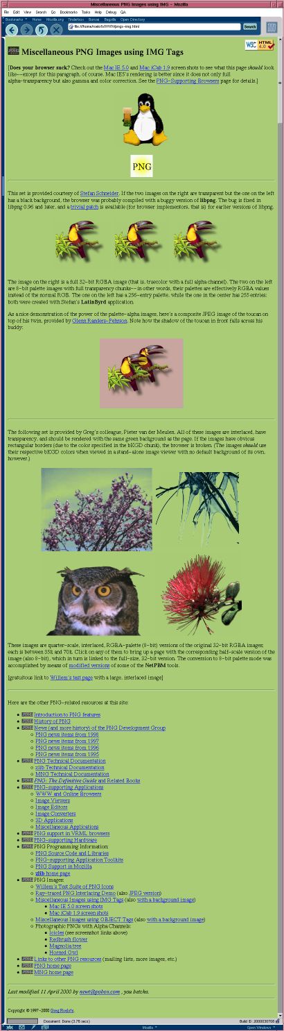 Mozilla's rendering of PNG transparency is nearly perfect, and it does gamma correction, too. But this version (April 2000) still had an interlacing bug that caused a rough appearance in most of the images (particularly along the edges of the penguin, owl and icicles). That bug was fixed the following month.