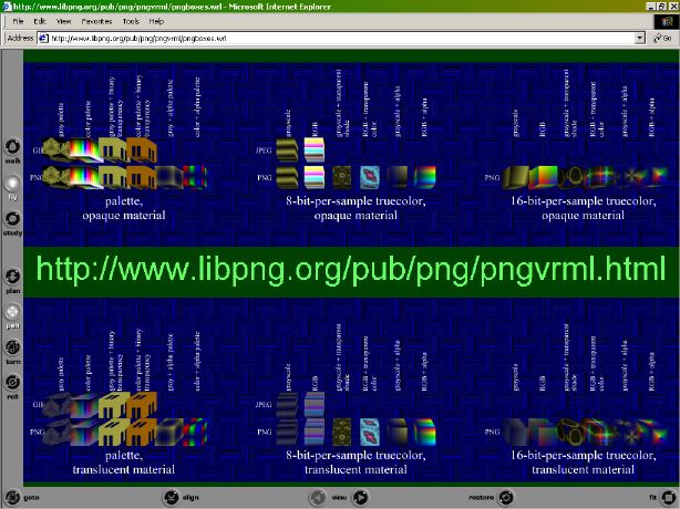 PNG texture-map support is required for minimal conformance with the Virtual Reality Modeling Language (VRML) 2.0 specification, so one might naïvely assume that by now, most ``VRML 2.0'' or ``VRML97'' (the ISO standard) browsers on the market would have perfect PNG support. Not so! Most of major browsers (that is, Cortona, Contact, Cosmo Player, WorldView, and LibVRML97/Lookat) do a fair job, but only three of them correctly render all of the basic texture/material combinations: Cosmo Player 2.1 for Irix, LibVRML97/Lookat 0.7.9 (or later--renamed to OpenVRML as of version 0.9.0), and Cortona 4.0.